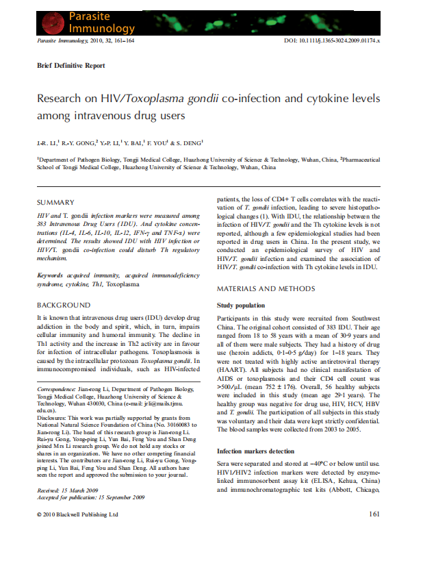 Research on HIV/Toxoplasma gondii co-infection and cytokine levels among intravenous drug users