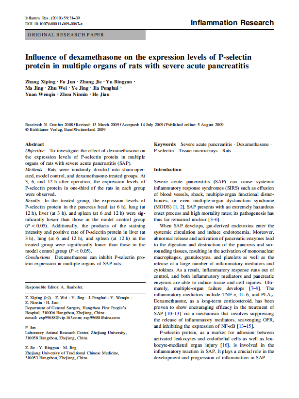 “晶美文献”Influence of dexamethasone on the expression levels of P-selectin protein in multiple organs of rats with severe acute pancreatitis