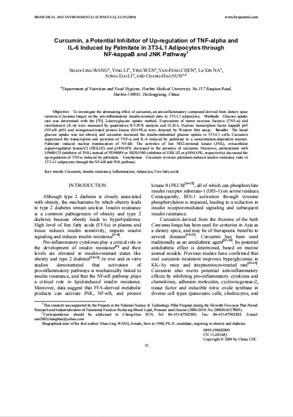 Curcumin, a Potential Inhibitor of Up-regulation of TNF-alpha and IL-6 Induced by Palmitate in 3T3-L1 Adipocytes through NF-kappaB and JNK Pathway