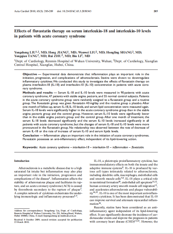 Effects of fluvastatin therapy on serum interleukin-18 and interleukin-10 levels in patients with acute coronary syndrome.