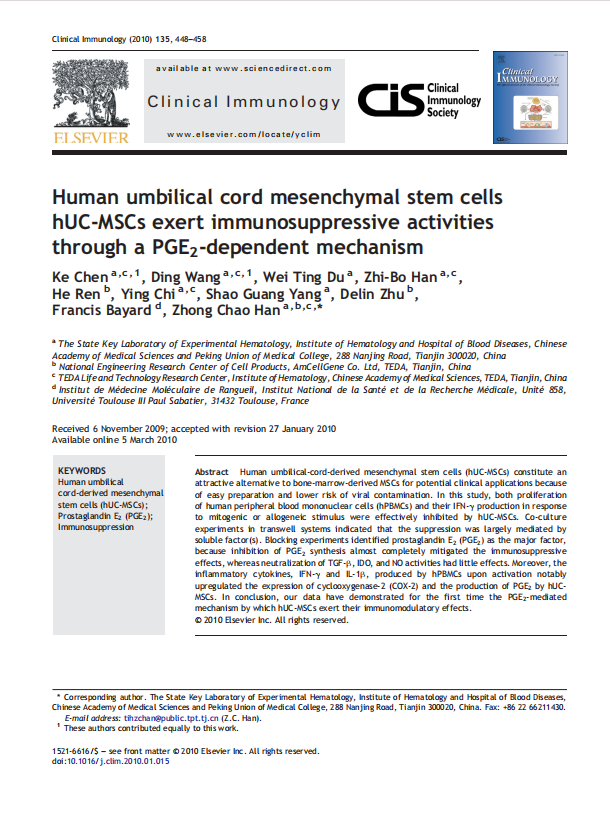 Human umbilical cord mesenchymal stem cells hUC-MSCs exert immunosuppressive activities through a PGE2-dependent mechanism