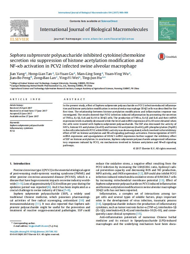 Sophora subprosrate polysaccharide inhibited cytokine/chemokine secretion via suppression of histone acetylation modification and NF-κb activation in PCV2 infected swine alveolar macrophage