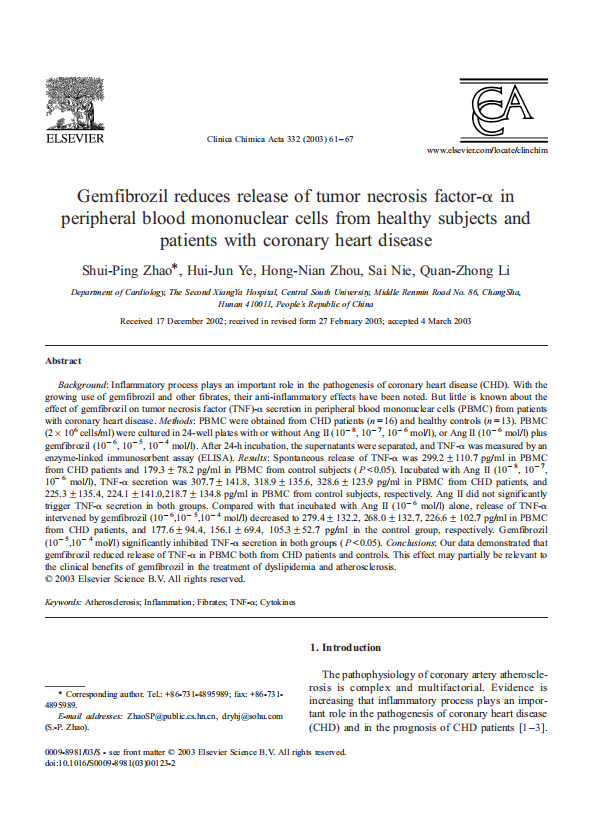 Gemfibrozil reduces release of tumor necrosis factor-α in peripheral blood mononuclear cells from healthy subjects and patients with coronary heart disease