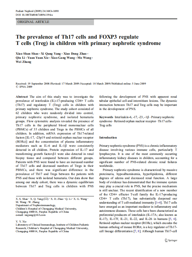 The prevalence of Th17 cells and FOXP3 regulateT cells (Treg) in children with primary nephrotic syndrome