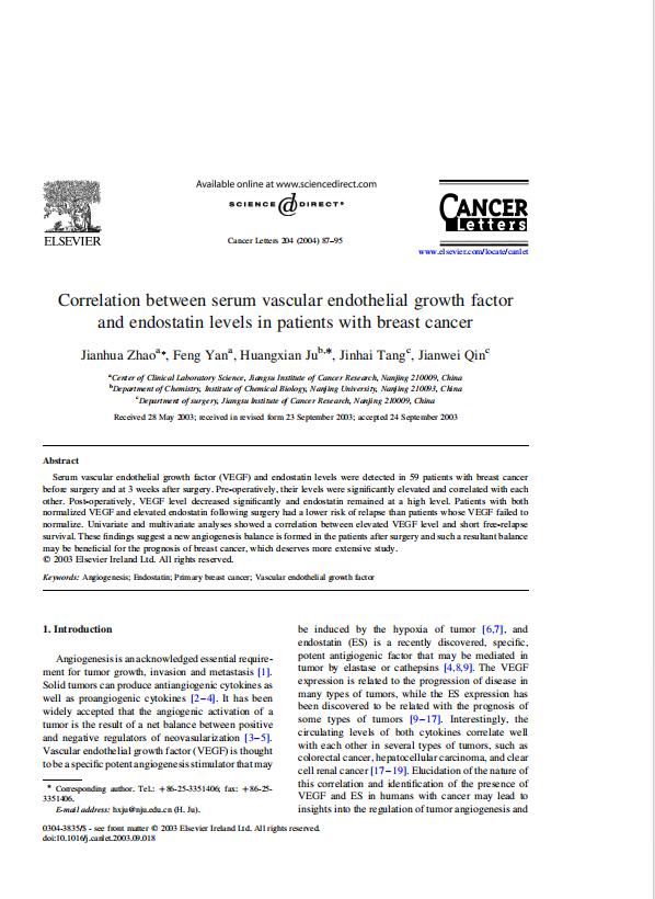 Correlation between serum vascular endothelial growth factor and endostatin levels in patients with breast cancer
